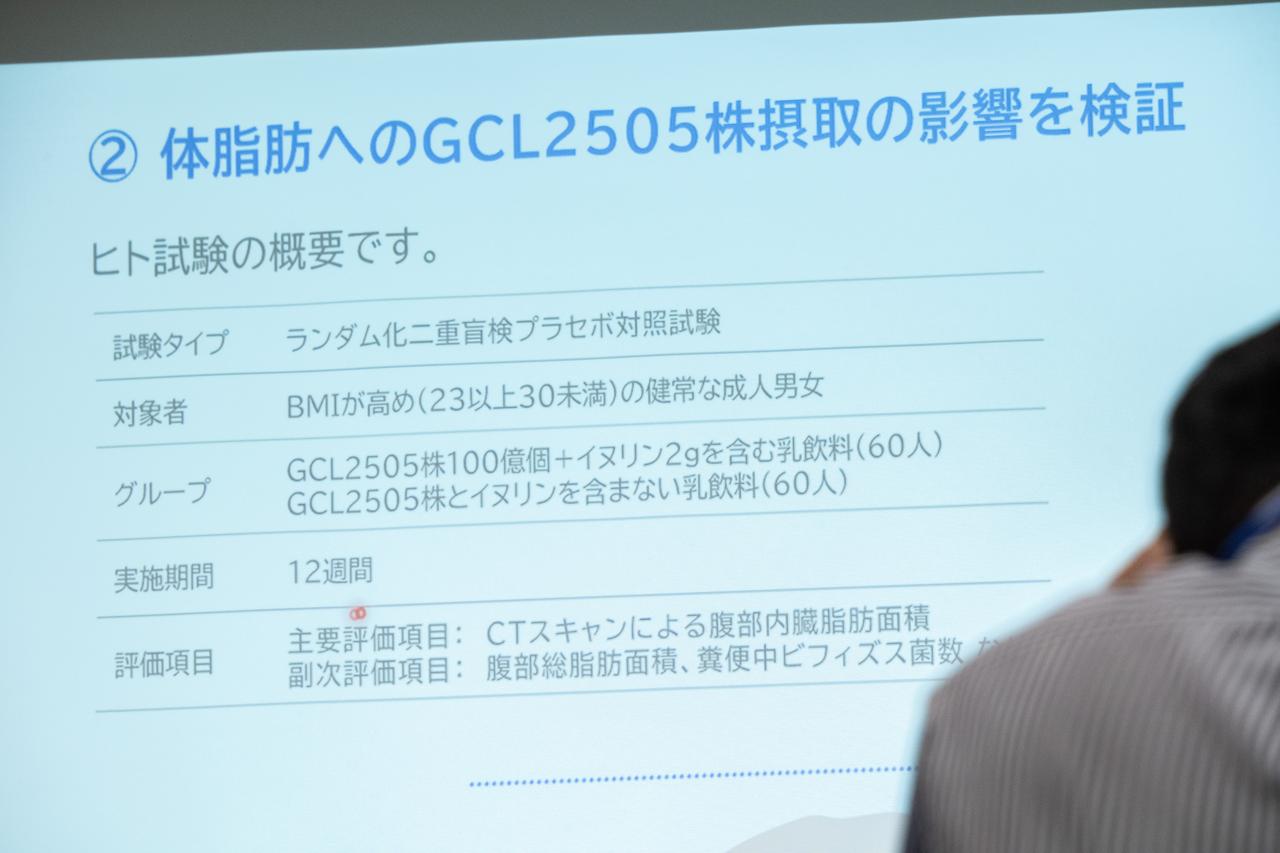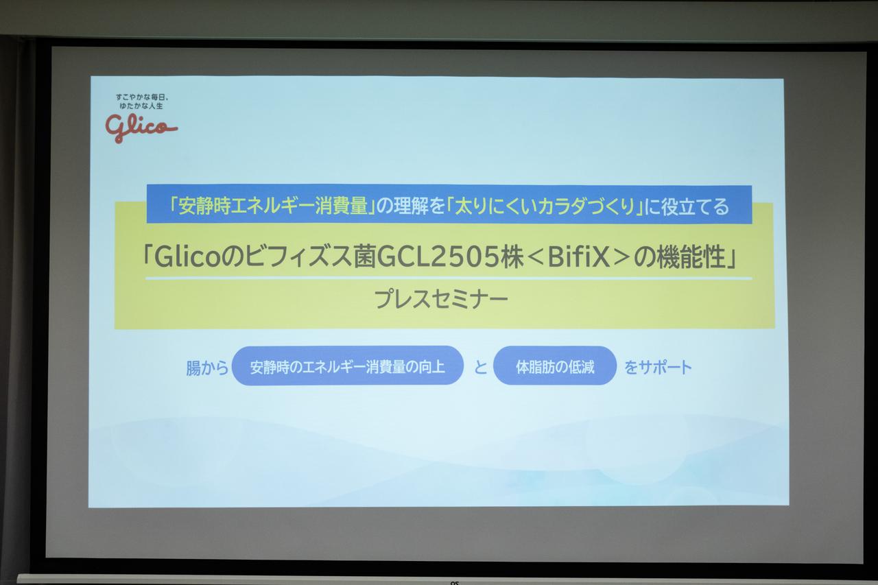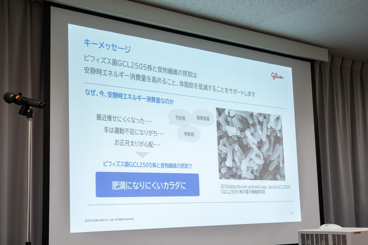 今回の発表では、グリコが長年研究を続けてきたビフィズス菌GCL2505に焦点を当て、腸内細菌が私たちの代謝にどのように関わっているのかが、科学的データとともに紹介されました。